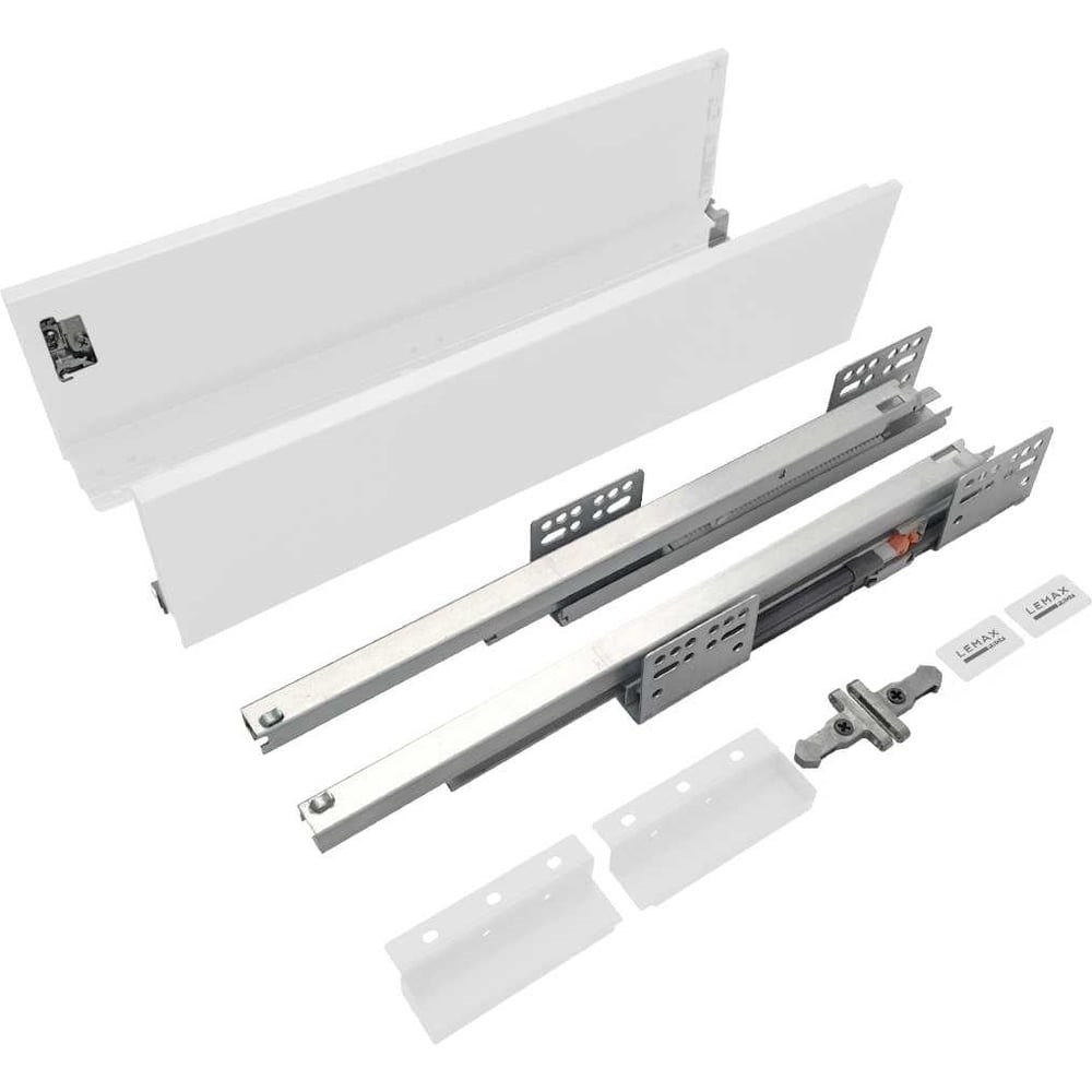 Система выдвижения с двойными металлическими боковинами Lembox представляет собой готовый комплект для создания выдвижного ящика. Самостоятельно требуется изготовить дно, заднюю стенку ящика и фасад. Тонкие прямоугольные боковины впишутся в любой интерьер и мебельный стиль. Благодаря толщине боковины всего лишь 12,8 мм ящик собирается с минимально возможными потерями полезного пространства. Бесшумность хода и плавное скольжения обеспечивает зубчато-реечный синхронизирующий механизм, встроенный в каждую направляющую. Боковые стенки изготовлены из прочной листовой стали и покрыты полимерно-порошковой краской, предохраняющей металл от коррозии. Благодаря этому ящики можно использовать в мебели для ванных комнат. Механизм направляющих рассчитан на нагрузку до 35 кг и 50000 циклов открывания/закрывания. Комплект поставки включает: направляющие скрытого монтажа (2 шт.); боковые стенки (2 шт.); коннекторы для крепления фасада (2 шт.); коннекторы для крепления задней стенки (2 шт.).