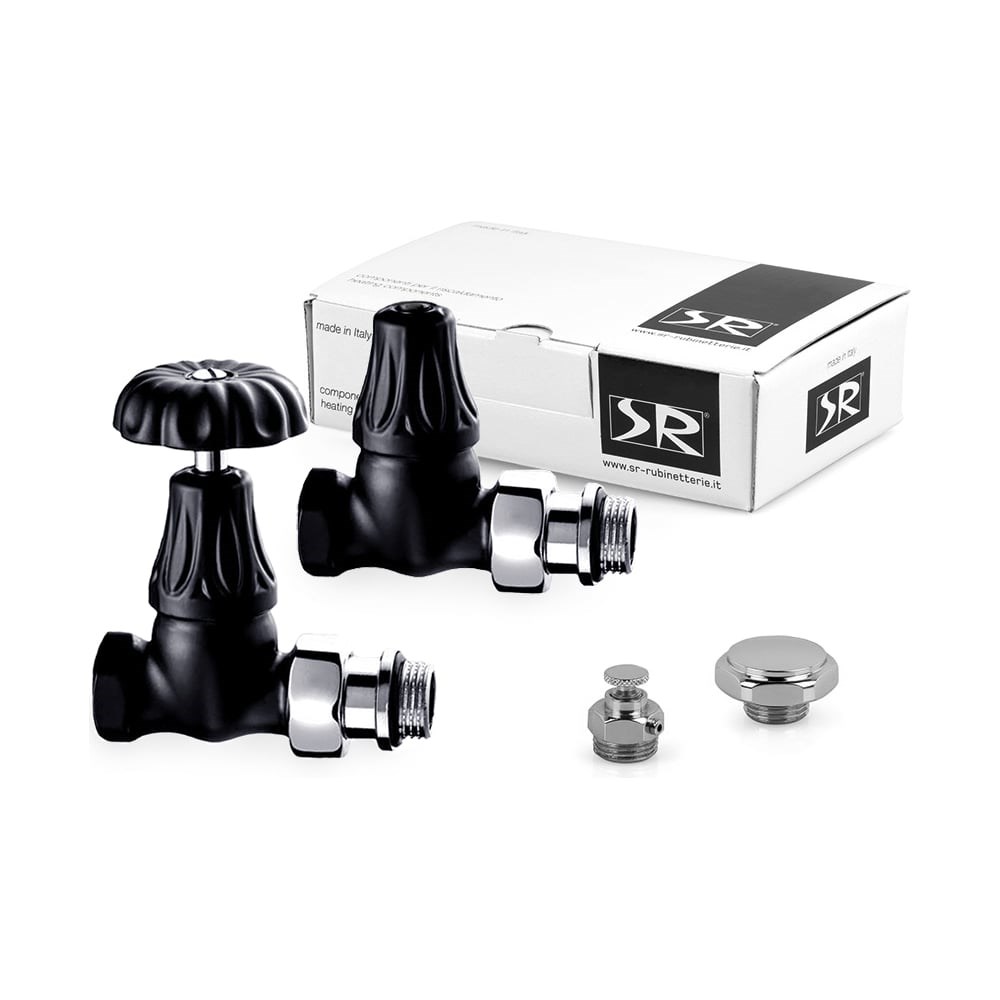 Комплект SR Rubinetterie серия Floral Old Style 1/2", прямой, цвет черный матовый K338-1500VC0S дополнительные характеристики: Рабочая среда - вода, гликолевые растворы. Максимальный процент гликоля - 30%. Максимальное рабочее давление - 10 бар. Максимальная рабочая температура - 100°C. Корпус - штампованная латунь CW617N - UNI EN 12165. Гайка - штампованная латунь CW617N - UNI EN 12165. Маховик регулировки - штампованная латунь CW617N - UNI EN 12165. Внутренние механизмы - прутковая латунь CW614N - UNI EN 12164. Уплотнительные элементы - резина EPDM PEROX.