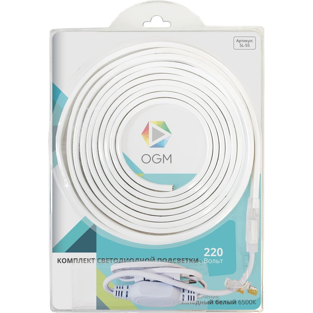 В состав готового комплекта от OGM входит 5 метров светодиодной ленты, которая работает от постоянного тока с напряжением 220В. Благодаря светодиодам SMD 2835 излучающим световой поток равный 600 Лм/м лента является прекрасным решением для воплощения в жизнь такого элемента декора, как декоративная подсветка в нежилых помещениях, беседках и уличных конструкциях. Она подойдет для декорирования ниш в стенах, многоуровневых потолков и даже мебели. По сравнению с лампами накаливания светодиодная лента эквивалентна лампам мощностью 60 Вт. Данная модель светодиодной ленты обладает холодным белым цветом свечения с цветовой температурой 6500 К. Также в состав комплекта входит шнур питания с коннектором для подключения к светодиодной ленте 220В. Степень защиты светодиодной ленты соответствует стандарту IP65, что позволяет использование не только во влажных помещениях, но и на улице. Отрезать светодиодную ленту можно в специально отмеченных местах, которые располагаются через каждый 1 метр. Компактные размеры светодиодной ленты с шириной 11 мм и основанием из гибкой, двухслойной, медной подложки дают огромное преимущество при создании любых дизайнерских фантазий. См. раздел “Комплектация”.