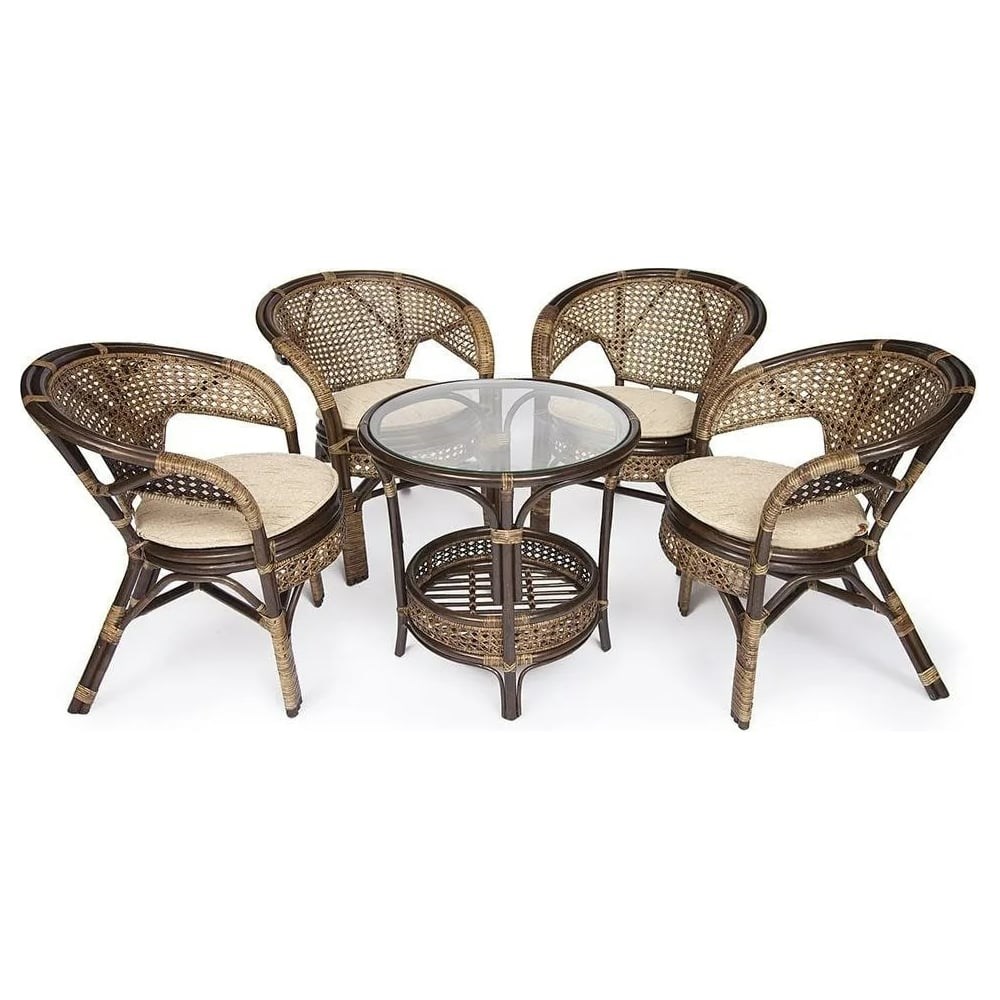 Комплект Tetchair PELANGI 02/15 стол со стеклом, 4 кресла без подушек, ротанг, грецкий орех 3597 - отличное решение для летних веранд, террас и садовых площадок различного стилевого решения. Ротанговый каркас, узорчатое плетение и оригинальный текстиль обеспечивают изделию не только прочность, но и индивидуальный характер. Данная модель удачно впишется в интерьер как загородного дома или дачи, так и дополнит дизайн современной городской квартиры. Идеальный вариант для ценителей стильной мебели!