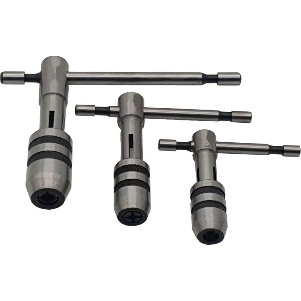 Комплект универсальных ручных патронов для метчиков ТЕХНОРЕАЛ AGTTW-3S состоит из трех патронов с Т-рукоятками для ручного нарезания резьбы метчиками. Комплект перекрывает размеры метчиков от М3 до М12. Каждый патрон оснащен стальными кулачками. Набор отличается большой универсальностью, так как в патроны можно зажимать также сверла, развертки и другой режущий инструмент.
