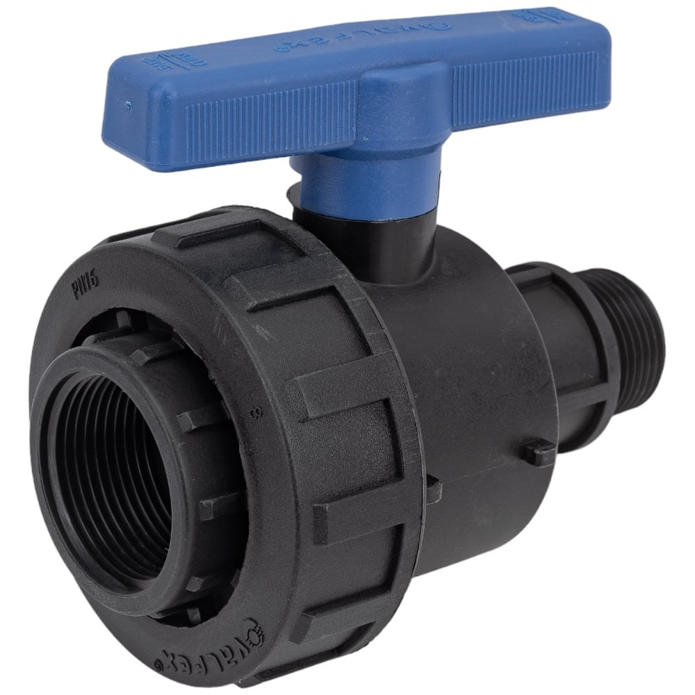 Компрессионный шаровой кран VALFEX ПНД НР/ВН резьба разборный 1"-1 1/4"Ду33 1210012100114 предназначен для транспортирования воды с температурой до 40° С и максимальным рабочим давлением 1,6 МПа в системах хозяйственно-питьевого водоснабжения, а также для транспортирования других жидких сред, к которым материал фитингов и их уплотнительных элементов химически стоек. Шаг резьбы полипропиленового шарового крана равен шагу стальных резьбовых фитингов, поэтому возможно их совместное применение.