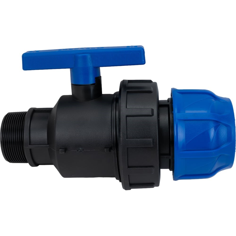 Шаровой кран VALFEX ПНД компрессионный цанга - наружная резьба, разборный 63x2" 1210012663200 предназначен для перекрытия потока транспортируемой жидкости. Применяется на трубопроводах холодного водоснабжения с температурой не более 40°С. Кран имеет с одной стороны наружную резьбу, равную стандартному размеру стальных резьб, а с другой цанговый зажим, что позволяет использовать кран шаровой компрессионный как переходной элемент трубопровода с возможностью регулирования потока воды.