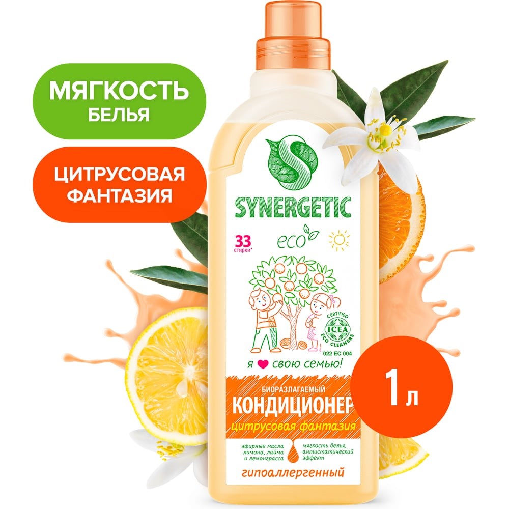 Кондиционер для белья Synergetic ЦИТРУСОВАЯ ФАНТАЗИЯ 1 л 4623722258212 – высокоэффективное средство, бережно ухаживающее за всеми типами ткани и придающее особую мягкость белью после стирки. Обладает антистатическим эффектом. Комплекс растительных К-тензидов обеспечивает легкую глажку белья. Гипоаллергенная отдушка с маслами лимона, петитгрейна, лайма и лемонграсса придаёт белью нежный аромат. Подходит для ручной и машинной стирки, полностью выполаскивается из тканей. Международный экологический сертификат ICEA подтверждает биоразлагаемость, безопасность и эффективность средства. Гипоаллергенный кондиционер-ополаскиватель нейтрализует остатки средств для стирки на тканях. Безопасен для септических установок. Подготовленная вода > 30%; К-тензиды (ПАВ из растительного масла) 5–15%; парфюмерная композиция с эфирными маслами лимона, петитгрейна, лайма и лемонграсса; пищевой краситель.