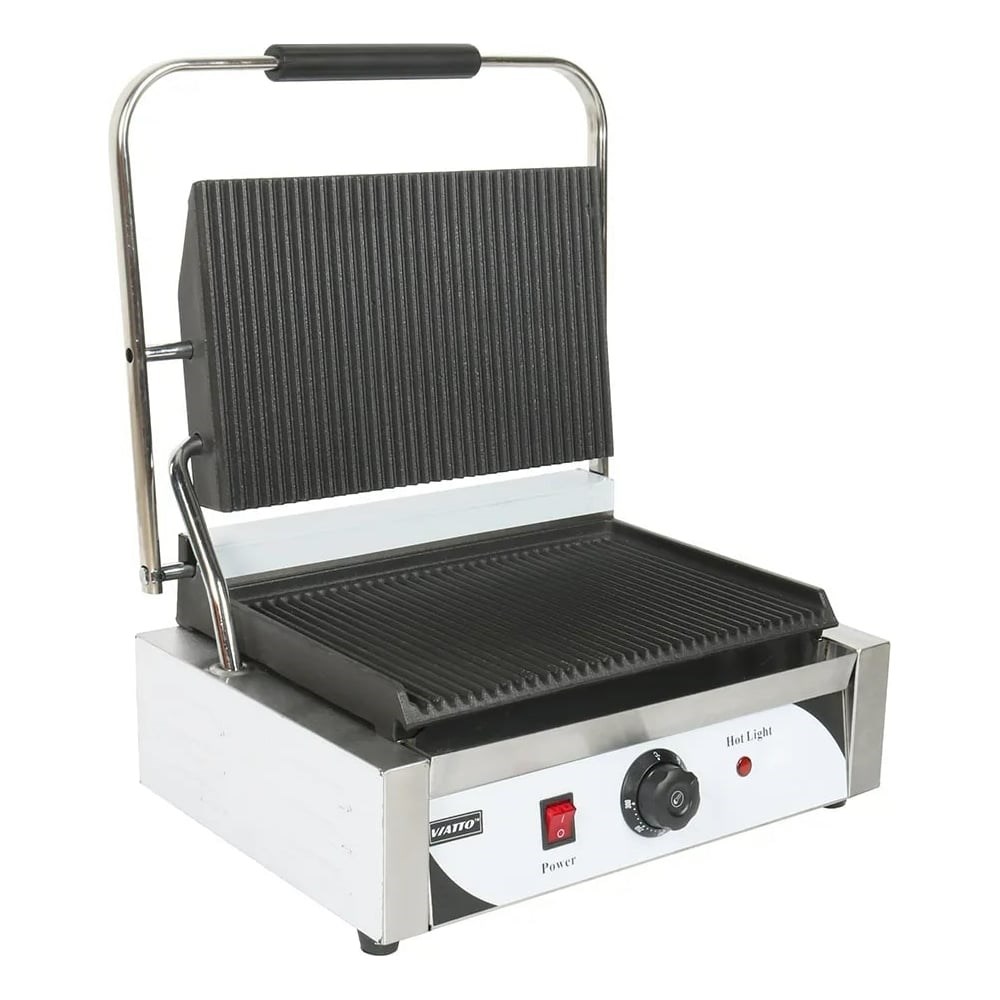 Контактный гриль Viatto VA-CG811 165368 предназначен для жарки мяса, рыбы, овощей, шаурмы, сендвичей. Приготовление продуктов происходит при контакте с жарочными поверхностями. Продукт обжаривается равномерно сразу с двух сторон, не требует добавления лишнего жира, не пригорает, сохраняет сочность. Ребристые поверхности изготовлены из чугуна и имеют антипригарное покрытие. Предусмотрен терморегулятор для точной установки температуры в пределах от +50 до +300 °С.