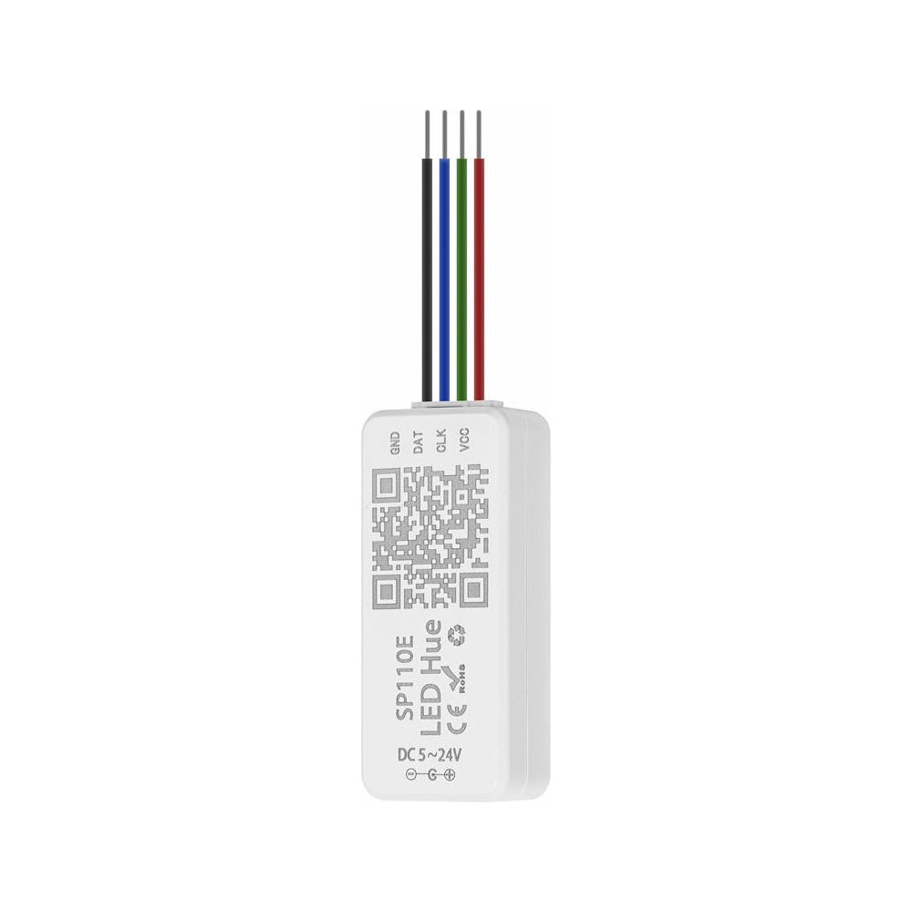 Контроллер MAKSILED 5-24В, 1024pix, SPI, управление по Bluetooth, без пульта, IP40, 56x25x14мм, SP110E для адресных светодиодных лент и управляемых пикселей с интерфейсом SPI. Для управления источником света скачайте бесплатно на свой телефон или планшет приложение LED Hue (доступно для мобильных устройств на Android и iOS).