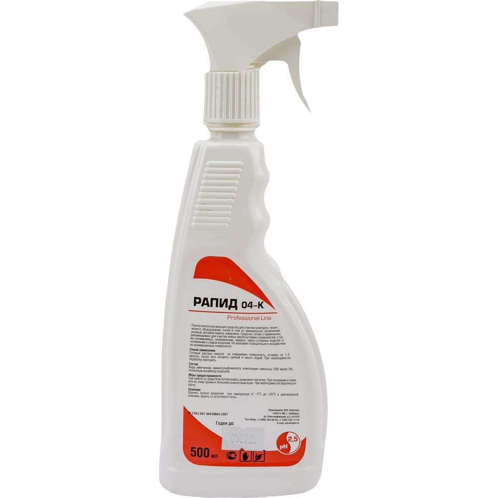 Кислотное средство Рапид 04-K предназначено для очистки санитарно-технического оборудования, полов и стен от минеральных загрязнений (ржавчина, водный, мочевой камень), а также алюминиевых, нержавеющих, медных, черно-сплавных изделий от потемнения и следов коррозии.Не оказывает отрицательного воздействия на хромированные поверхности.Применяется для очистки варочного оборудования, шампуров, алюминиевых палок от застарелых загрязнений.