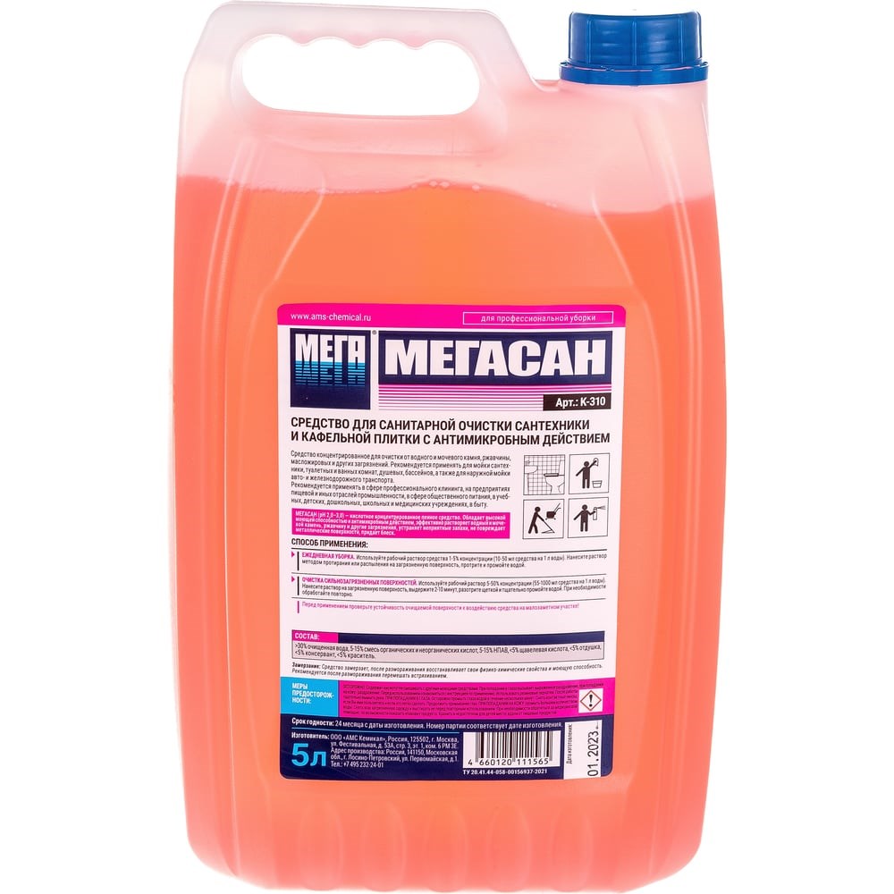 Средство для санитарной очистки сантехники и кафельной плитки с антимикробным действиемСредство кислотное концентрированное для очистки от водного и мочевого камня, ржавчины, масложировых и других загрязнений. Рекомендуется применять для мойки сантехники, туалетных и ванных комнат, душевых, бассейнов, а также для наружной мойки авто- и железнодорожного транспорта. Средство обладает высокой моющей способностью и антимикробным действием, устраняет неприятные запахи. Не повреждает металлические поверхности, придает блеск.Рекомендуется применять в сфере профессионального клининга, на предприятиях пищевой и иных отраслей промышленности, в сфере общественного питания, в учебных, детских, дошкольных, школьных и медицинских учреждениях, гостинично-ресторанных, спортивных, развлекательных и торговых комплексах, на транспортных и ремонтных предприятиях, в общественных и административных зданиях, в быту.Перед применением проверьте устойчивость очищаемой поверхности к воздействию средства на малозаметном участке!Ежедневная уборка Используйте рабочий раствор средства 1-5% концентрации (10-50мл средства на 1л воды). Нанесите раствор методом протирания или распыления на загрязненную поверхность, протрите и промойте водой.Очистка сильнозагрязненных поверхностей Используйте рабочий раствор 5-50% концентрации (55-1000мл средства на 1л воды). Нанесите раствор на загрязненную поверхность, выдержите 2-10 минут, разотрите щеткой и тщательно промойте водой. При необходимости обработайте повторно.