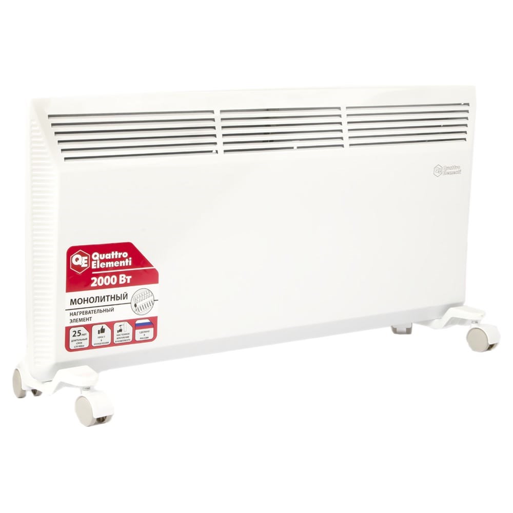 Конвекторный нагреватель воздуха QUATTRO ELEMENTI QE-2000KM 2 кВт. 790-540 выполнен в классическом белом цвете - для гармоничного размещения в любом интерьере помещения. Все составляющие выполнены из надежных и качественных материалов, что гарантирует продолжительный срок службы. Конвектор справится с обогревом помещения площадью до 25 м². Оборудование можно разместить на стене, либо установить опоры с колесами, тогда прибор легко перемещается для обогрева в необходимое место.