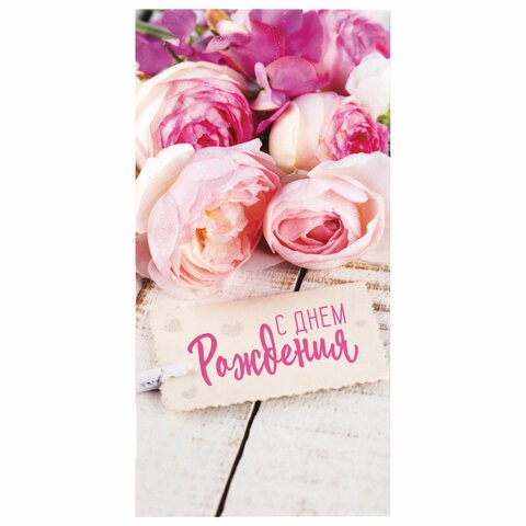Конверт с изображением пионовидных роз и надписью "С ДНЕМ РОЖДЕНИЯ" изготовлен из высококачественного картона плотностью 215 г/м2. Отделка - блестки. Размер - 166х82 мм.