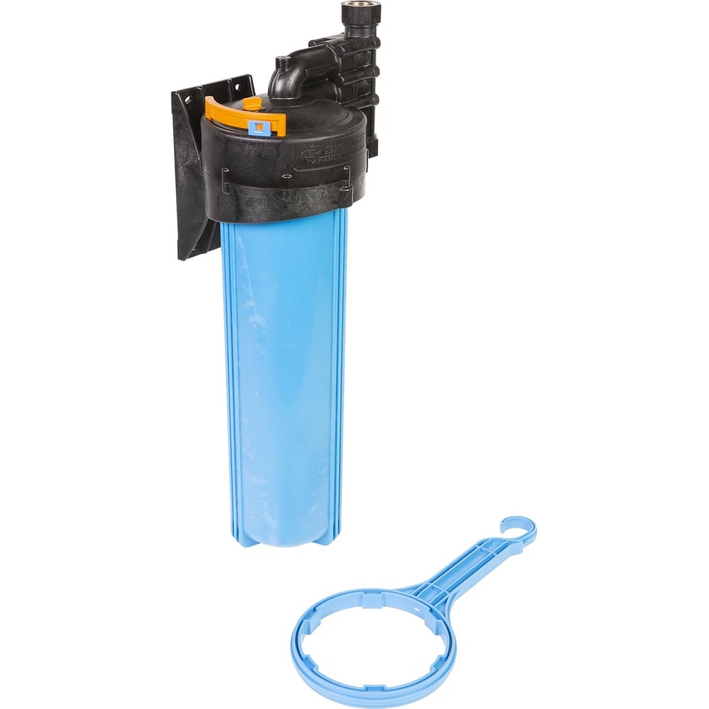 Корпус для картриджного фильтра предназначен для размещения в нём картриджей или фильтрующей засыпкидля дальнейшей очистки холодной воды в бытовых условиях. Изготавливается из армлена, прочного материала устойчивого к циклическим нагрузкам и не пропускающего ультрафиолетовые лучи сквозь корпус. Типоразмер колбы - Big Blue 20”. Данная модель предназначена для установки на вертикальной трубопровод.Технические особенности:На крышке корпуса установлены календарь для удобства отслеживания замены фильтрующего элемента и пробка для сброса избыточного давления.Для слива воды из корпуса фильтра (при замене фильтрующего элемента) предусмотрена резьбовая заглушка, находящаяся в нижней части колбы.В комплект поставки входит ключ, с помощью которого можно отвернуть колбу/накидную гайку от крышки.Для монтажа к стене на крышке корпуса предусмотрен кронштейнТехнические характеристики:Пропускная способность: 80 л/минМодификация корпуса: Big BlueДавление подводимой воды: до 10 барДопустимая температура воды: + 1 + 40 С