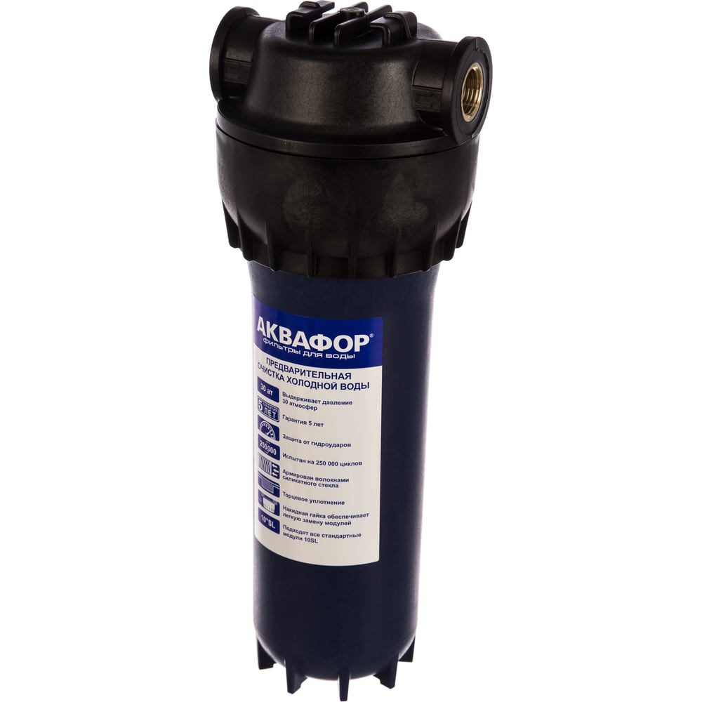 Корпус предфильтра для холодной воды армированный G1/2" Аквафор предназначен для установки в него сменного фильтрующего элемента установочной длины 254 мм (10") для удаления из холодной воды песка, ржавчины и других примесей. Корпус оснащен латунными вставками, благодаря которым полностью исключается возникновение напряжений в соединении "корпус-штуцер". Присоединительная резьба трубная цилиндрическая G1/2".