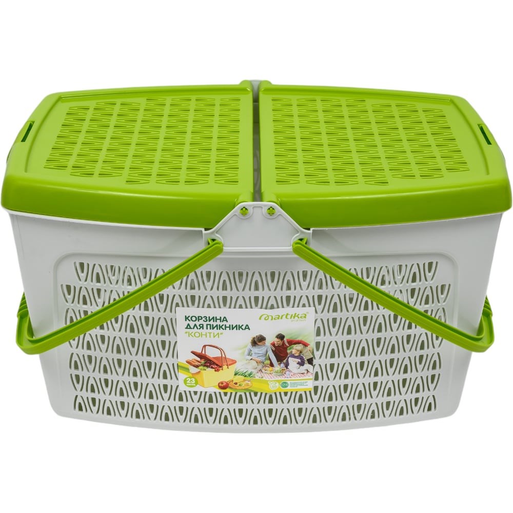 Корзина для пикника Martika Конти 23 л, с крышкой С731 - незаменимая вещь для поездок на природу. Крышка оснащена защелками и отлично подходит для переноски различных вещей и продуктов. Надежность. Изготовлена из пластика, благодаря чему отличается прочностью и небольшим весом. Внимание! Товар поставляется в нескольких цветах - коричневый и зеленый. Возможности выбора нет.