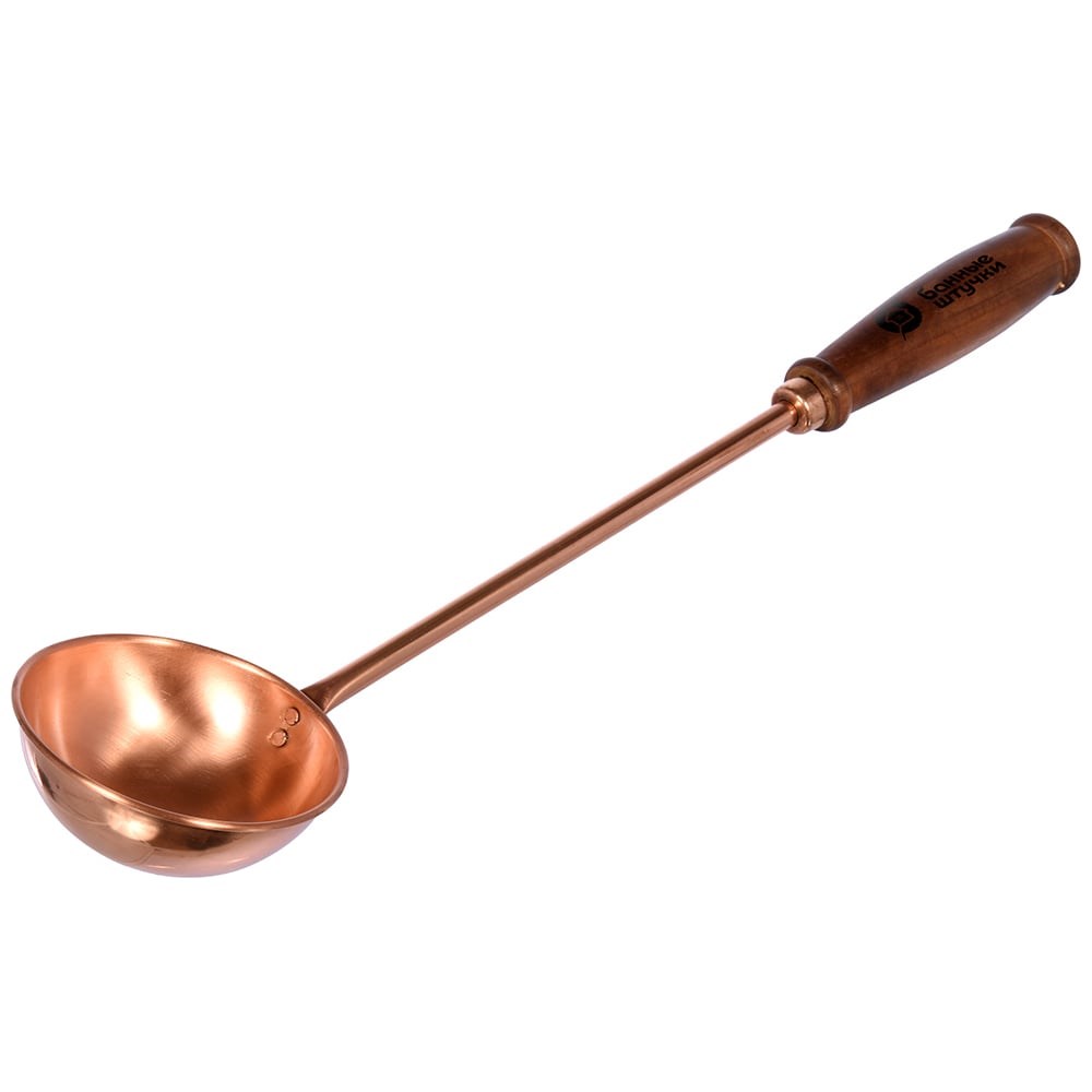 Ковш из меди Банные штучки 45 см 32030 - специальное приспособление для полива каменки. Имеет длинную горизонтальную ручку. В баню невозможно ходить без определенных атрибутов, которые стали уже традиционными. В их число входят ведра, бадьи, ковши из различных материалов - медь, оцинкованная и нержавеющая сталь. Длина деревянной ручки 14 см.