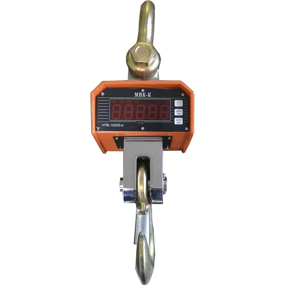 Крановые весы Мир Весов МВК-К-10000 09710 - современное устройство, предназначенное для статического взвешивания крупногабаритных тяжелых грузов. Корпус выполнен из легированной стали. Яркий светодиодный дисплей с крупными символами (до 35 мм) отображает все результаты измерений. Весы управляются как с кнопок на корпусе, так и при помощи пульта дистанционного управления (дальность действия до 15 м). В основе принципа действия весов лежит преобразование упругого элемента весоизмерительного датчика, возникающего в результате воздействия силы тяжести подвешенного на весы груза, в аналоговый электрический сигнал, пропорциональный массе груза. Полученный сигнал впоследствии подвергается аналого-цифровому преобразованию и математической обработке электронными устройствами весов с последующим определением массы взвешиваемого объекта.