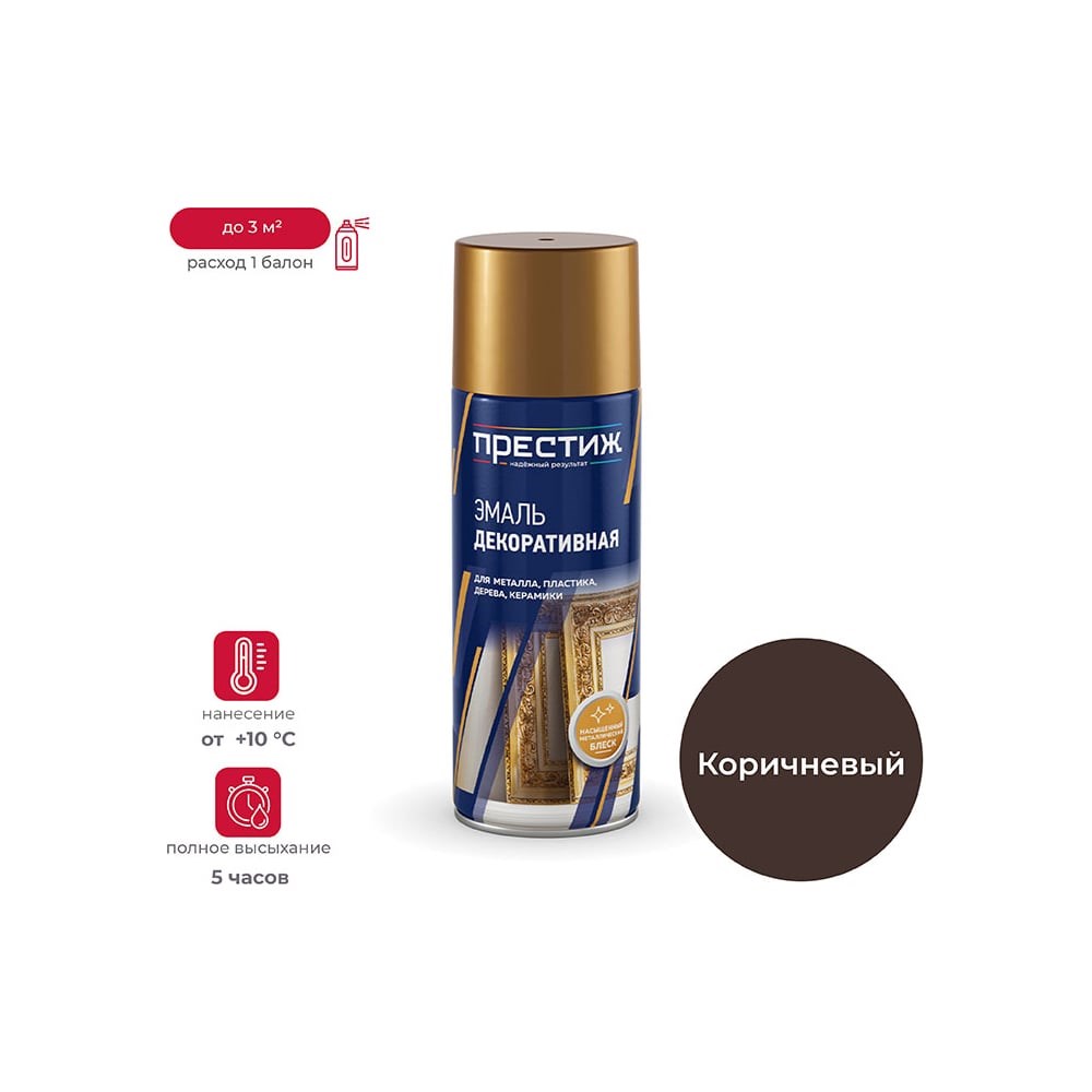 Предназначена для окраски предварительно загрунтованных металлических и деревянных поверхностей. Применяется для наружных и внутренних работ. Основа : алкидная; Степень блеска: высокоглянцевая; Высыхание: полное высыхание 5 часов; Температура нанесения: не ниже +10°С; Расход: 1 баллон до 3 м² Срок годности: 3 года Коричневый Универсальная аэрозольная краска ПРЕСТИЖ Аэрозольная алкидная эмаль при нанесении образует долговечное покрытие. Удобна в использовании и позволяет быстро закрасить нужную поверхность. Универсальная аэрозольная краска ПРЕСТИЖ обеспечивает надежную защиту окрашиваемых поверхностей, высокую прочность, длительный срок эксплуатации. Легко наносится даже в труднодоступные места. Преимущества: - высококачественная. - атмосферостойкая; - равномерное распыление; - хорошая укрывистость; - высокая сопротивляемость к ударам, изгибам и другим механическим воздействиям.