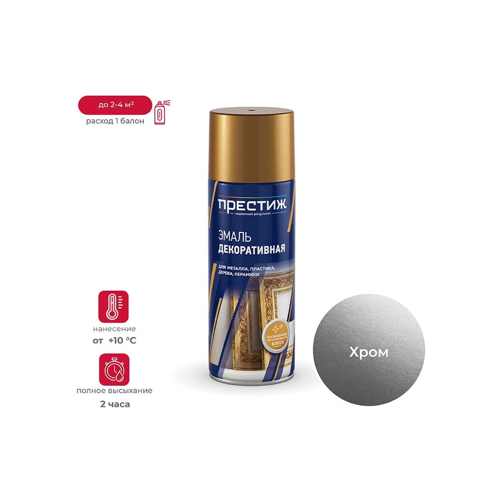Предназначена для защитно-декоративного окрашивания металла, пластика, дерева, бетона, камня, стекла, керамики и других поверхностей. Применяется для внутренних и наружных работ. Основа: акриловая; Степень блеска: насыщенный металлический блеск; Высыхание: 30 минут/ полное высыхание 2 часа; Стойкость поверхности: атмосферостойкая; Расход: 1 баллон до 2-4 м²; Температура нанесения: от +10 до +35 ºС Срок годности: 3 года Хром Аэрозольная акриловая краска с эффектом металлик ПРЕСТИЖ Быстросохнущая аэрозольная акриловая краска легко наносится на труднодоступные поверхности. Имеет яркий и насыщенный металлический блеск. Создает эффектное декоративное покрытие с защитными свойствами. Благодаря удобной форме в виде аэрозоля равномерно ложится по поверхности изделия. Покрытие блестит и внешне выглядит как металлическая поверхность. Преимущества: - высококачественная, - ложится ровным слоем; - хорошо закрашивает даже при нанесении в один слой; - удобна в использовании; - быстро сохнет; - дает простор творческой фантазии.