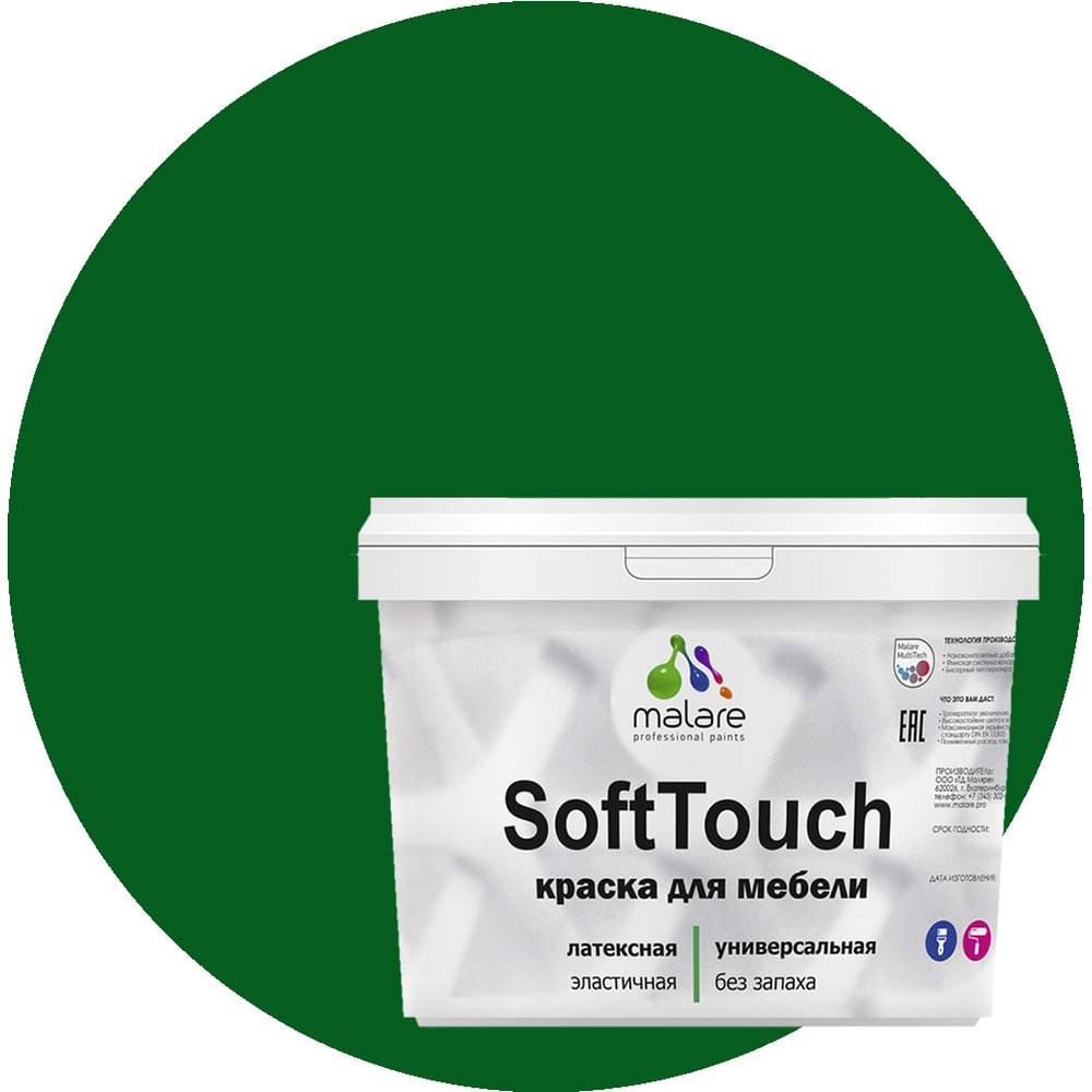 Краска для мебели, кухонных фасадов MALARE SoftTouch матовая, зеленый мичиган, 10 кг 2036773367819 предназначена для защитно-декоративного окрашивания любых деревянных, минеральных и металлических поверхностей, как фасадных, так и интерьерных. Обладает высокой износостойкостью и экономичностью. Материал пожаро- и взрывобезопасен. Не смешивать с другими красками и органическими растворителями. Рекомендована для окрашивания: мебели кровель и цоколей фасадов и интерьеров любых деревянных изделий