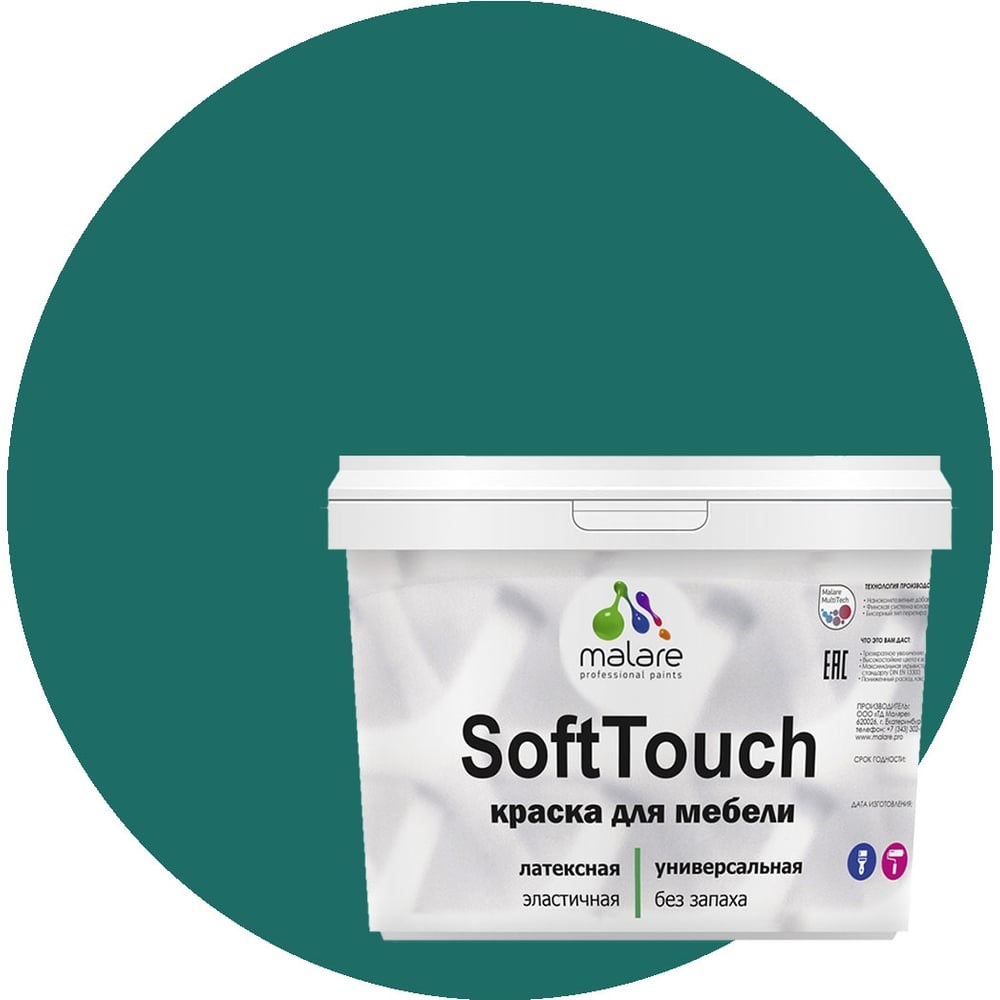 Краска для мебели, кухонных фасадов MALARE SoftTouch матовая, атлантида, 10 кг 2036747533257 предназначена для защитно-декоративного окрашивания любых деревянных, минеральных и металлических поверхностей, как фасадных, так и интерьерных. Обладает высокой износостойкостью и экономичностью. Материал пожаро- и взрывобезопасен. Не смешивать с другими красками и органическими растворителями. Рекомендована для окрашивания: мебели кровель и цоколей фасадов и интерьеров любых деревянных изделий