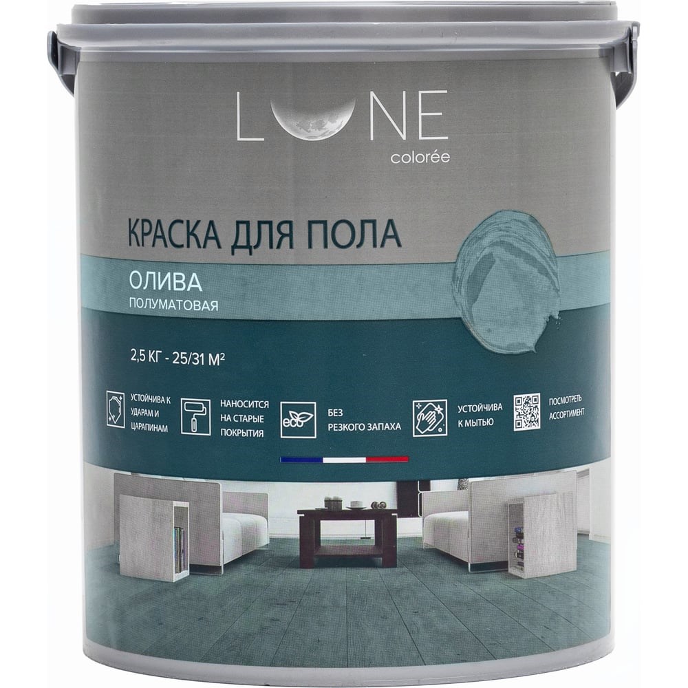 Краска для пола акриловая полуматовая быстросохнущая LUNE COLOREE, цвет Олива (оливковая), 2,5 кг. Краски для пола LUNE Coloree образует прочный и стойкий к истиранию каркас на поверхности пола и лестниц. Материал очень технологичный – легко наносится и не требует грунтовки. Акриловая краска для пола подходит для таких поверхностей как: дерево, в том числе лакированное и окрашенное, ламинат, паркет, бетон, МДФ, ДСП, так же допускается окраска террас, защищенных от прямого воздействия осадков. Продукт изготовлен на водной основе и не имеет резкого запаха. Окрашенная поверхность не скользит. Класс истирания (DIN EN13300): класс 1 (<5 мкм при 200 циклах истирания). Сухой остаток: не менее 40%. Плотность: 1,15-1,25 г/см³. Подготовка поверхности. Перед нанесением краски для пола поверхность необходимо очистить, обезжирить и хорошо просушить. Отслаивающиеся старые покрытия должны быть удалены. Гладкие высокоглянцевые поверхности рекомендуется предварительно зашкурить и обезжирить. Поверхности, образующие пыль (например, бетон), необходимо загрунтовать. Перед применением содержимое банки тщательно перемешать. Способ применения. В работе с краской для пола использовать валик, кисть, краскопульт. Рекомендуется покрытие 2-х и более слоев краски с межслойной сушкой не менее 2 часов. В случае необходимости снижения вязкости добавить не более 5% воды. Полное высыхание 24 ч. Для набора оптимальной прочности лакокрасочного покрытия необходимо 28 суток. Расход: 1 литр: 10-12 м².