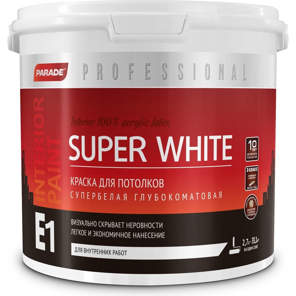 Краска для потолков PARADE SUPER WHITE E1 база А 2,7 л Россия Лк-00008437 - профессиональная глубокоматовая супербелая краска. Образует прочное высокодекоративное покрытие, которое выдерживает влажную уборку (3 класс мокрого истирания по DIN EN 13300). Глубокоматовое покрытие визуально скрывает дефекты основания. За счет входящих в состав частиц мрамора краска эффективно рассеивает свет, усиливая белизну покрытия.