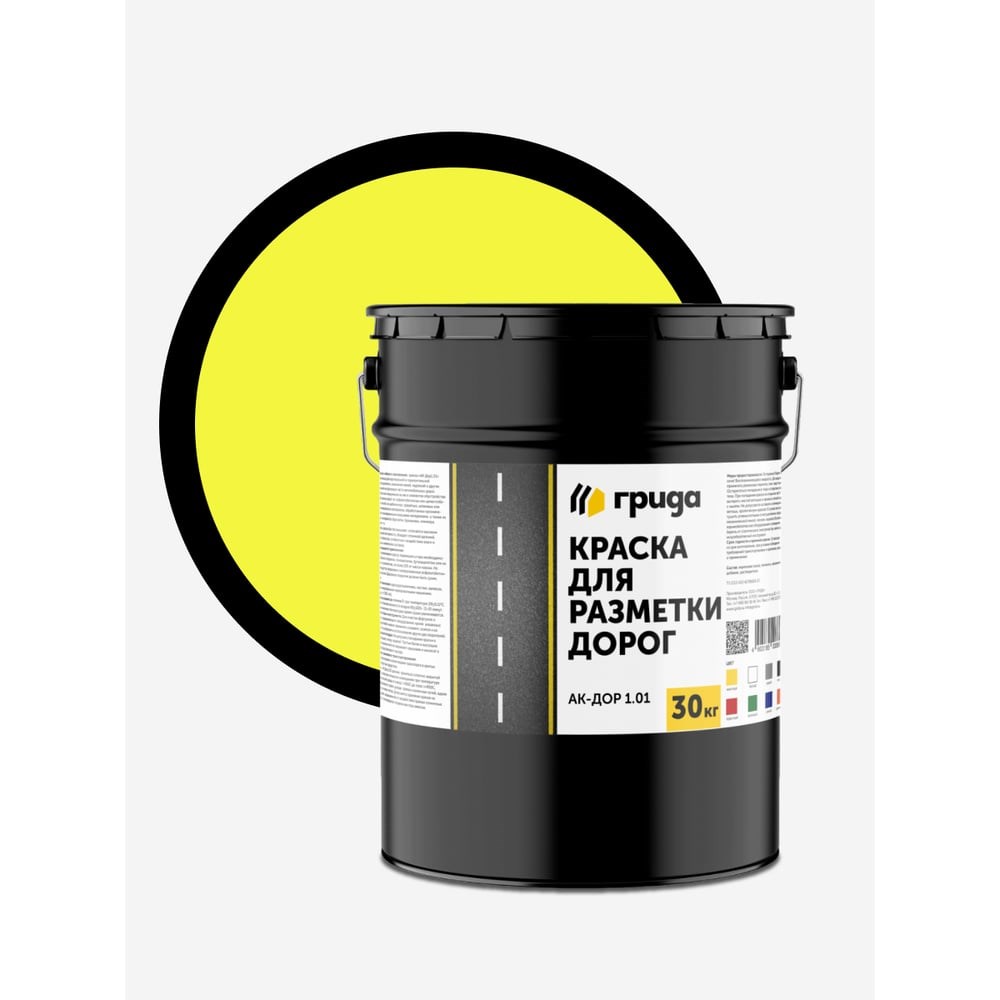 Краска для разметки дорог АК-Дор 1.01 ГРИДА предназначена для нанесения линий, надписей и других обозначений основной разметки на проезжую часть автомобильных дорог с усовершенствованным (асфальтобетонным) покрытием, бордюры, элементы дорожных сооружений и обстановки дороги; для окраски цементно-бетонных поверхностей. Линейка АК-Дор 1.01 содержит максимальное количество акрилатного связующего и как следствие максимальную стойкость к истиранию.Свойства:Краска быстро высыхает, отличается высоким уровнем светостойкости и коэффициентом яркости, что служит гарантией видимости разметки в любое время суток. Кроме того, обладает отличной адгезией, износостойкостью, стойкостью к воздействию влаги и различных химических составов.Характеристики:Время высыхания при температуре (20±0,5)ºС и относительной влажности воздуха (65±10)%- 10 минут. При пониженных температурах время сушки увеличивается.Долговечность нанесённой разметки, в зависимости от интенсивности движения.Износостойкость по методике ДорНИИ: 95%.Массовая доля нелетучих веществ: 75%.Расход 300 - 600 г/м2 на однослойное покрытие в зависимости от шероховатости и пористости поверхности, применяемого оборудования, квалификации персонала и других факторов.Степень перетира: 70 мкм.Стойкость покрытия к воздействию 3%-го раствора хлористого натрия.Стойкость покрытия к статическому воздействию воды.Условная вязкость (определяется вискозиметром типа ВЗ-246, с диаметром сопла 4 мм, при температуре 20 °С): 55 секунд.