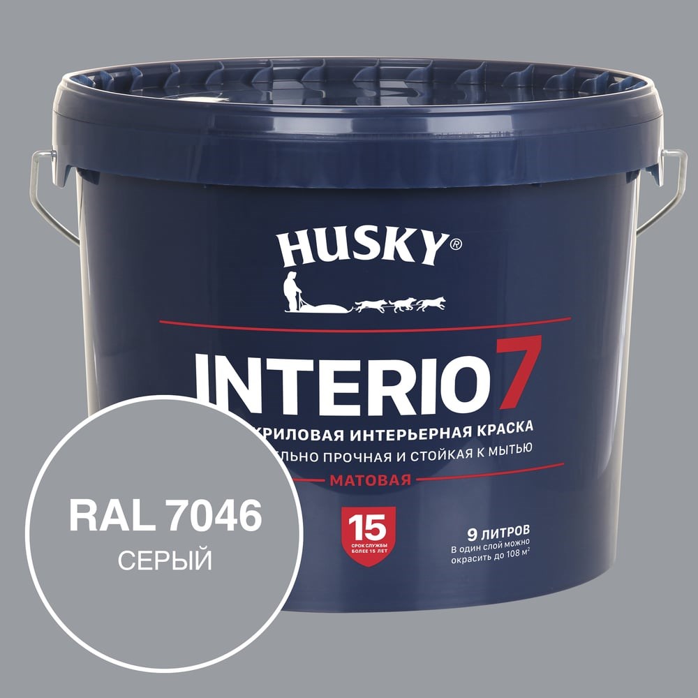 100% акриловая интерьерная краска HUSKY INTERIO 7 — матовая исключительно прочная и стойкая к мытью акриловая краска премиум-класса для стен и потолков во всех типах сухих и влажных помещений: гостиные, кухни, ванные комнаты, холлы, детские комнаты, спальни, офисные помещения и т.д. Применяется для окраски бетонных, зашпатлеванных, оклеенных обоями, обшитых древесиной, ДВП, ДСП, ПВХ, гипсокартонными листами поверхностей. Краска обеспечивает исключительную легкость нанесения в сочетании с практически идеальным качеством и долговечностью покрытия. Окрашенные поверхности сохраняют равномерную матовость и чистоту цвета не менее 15 лет. Страна производства — Россия. Краска обладает высокой степенью укрывистости. Легко и равномерно наносится на поверхность. Не разбрызгивается при нанесении, не оставляет потеков, полос и следов от инструмента. Окрашенные поверхности выдерживают сухую и влажную уборку с мягкими моющими средствами. Полную прочность, достаточную для мытья окрашенных поверхностей, краска приобретает в течение 14 дней.