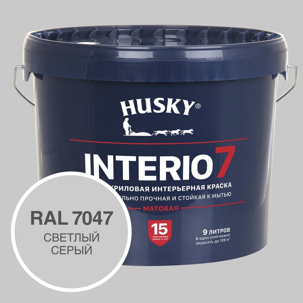 100% акриловая интерьерная краска HUSKY INTERIO 7 — матовая исключительно прочная и стойкая к мытью акриловая краска премиум-класса для стен и потолков во всех типах сухих и влажных помещений: гостиные, кухни, ванные комнаты, холлы, детские комнаты, спальни, офисные помещения и т.д. Применяется для окраски бетонных, зашпатлеванных, оклеенных обоями, обшитых древесиной, ДВП, ДСП, ПВХ, гипсокартонными листами поверхностей. Краска обеспечивает исключительную легкость нанесения в сочетании с практически идеальным качеством и долговечностью покрытия. Окрашенные поверхности сохраняют равномерную матовость и чистоту цвета не менее 15 лет. Страна производства — Россия. Краска обладает высокой степенью укрывистости. Легко и равномерно наносится на поверхность. Не разбрызгивается при нанесении, не оставляет потеков, полос и следов от инструмента. Окрашенные поверхности выдерживают сухую и влажную уборку с мягкими моющими средствами. Полную прочность, достаточную для мытья окрашенных поверхностей, краска приобретает в течение 14 дней.