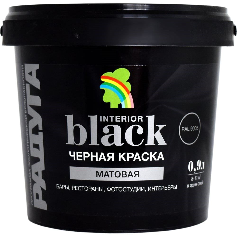 Краска для стен и потолков Радуга ВД-АК 26 (черная; 0,9 л) 4630058021489 - полнотоновая черная (RAL 9005) акриловая водоразбавляемая краска высокой укрывистости для окрашивания предварительно подготовленных поверхностей стен и потолков внутри помещений с высокими эксплуатационными требованиями (коридоры, гостиные, спальни, гардеробные и пр.). Наносится на различные виды оснований – кирпичная и каменная кладка, бетон, штукатурка, ГВЛ, ГКЛ, обои под покраску, а также для перекрашивания прочных ранее окрашенных оснований.