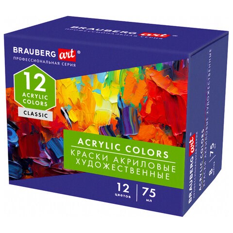 Краски акриловые художественные глянцевые 12 цветов в тубах по 75 мл, BRAUBERG ART CLASSIC, 192426