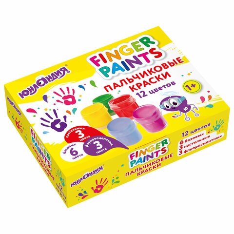 Краски пальчиковые для малышей от 1 года, 12 цветов (6 базовых + 3 пастельных + 3 флуоресцентных) по 35 мл, ЮНЛАНДИЯ, 192570