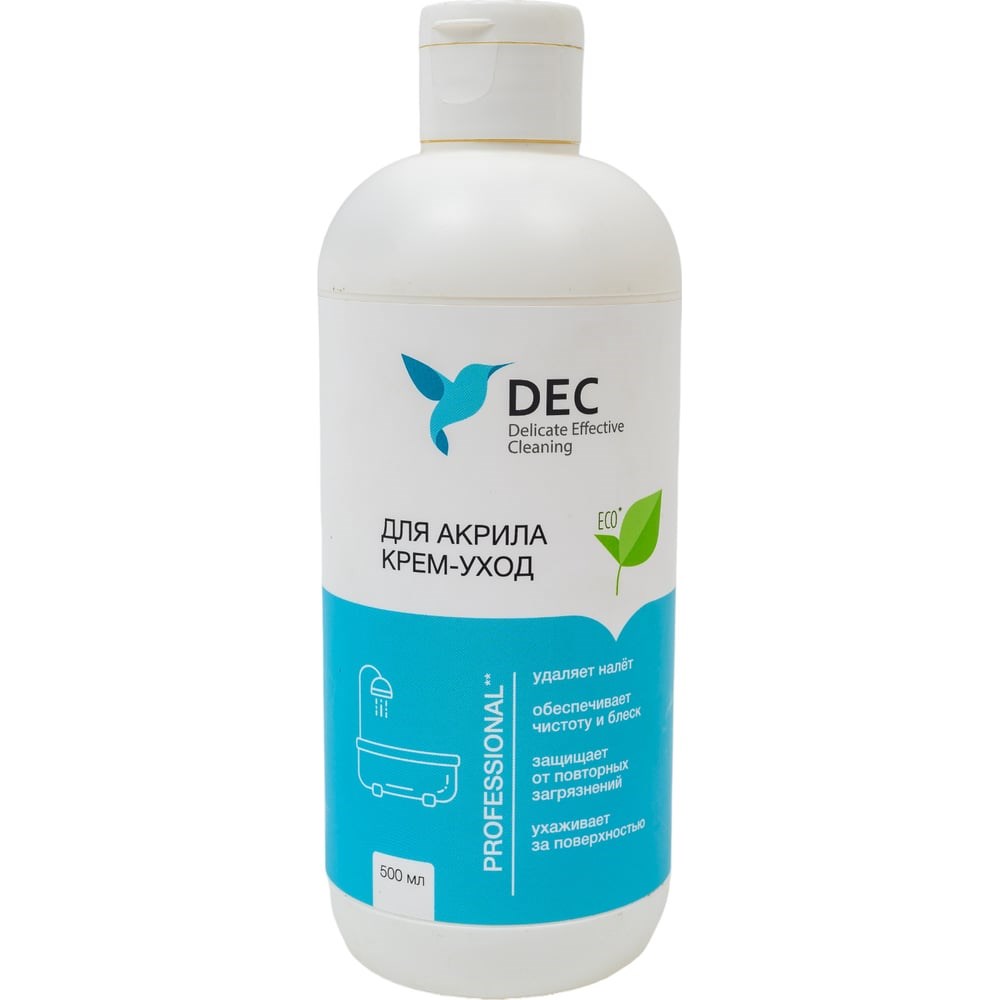 Средство по уходу за акрилом и другими искусственными поверхностями. DEC Крем для чистки и ухода за акрилом (0,5 л) DEC-акрил-0,5 нейтрализует всевозможные загрязнения с поверхностей в санитарных помещениях (ванна, душевые кабины, туалет, гидромассажные ванны). Справляется с мыльными, масляными, соляными отложениями, образуя защитную пленку, предотвращающую дальнейшие загрязнения.Придает блеск, в том числе смесителям из хрома и высококачественной стали. Не раздражает кожу рук. Не оставляет разводы. Не содержит соляную кислоту и иные агрессивные, абразивные вещества.
