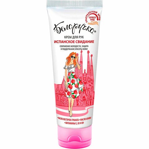 Окунувшись в романтические мечты о путешествиях, не забывайте об уходе за руками. Крем Белоручка ИСПАНСКОЕ СВИДАНИЕ перенесет в жизнерадостную и страстную Испанию, окутав кожу рук ярким ароматом спелого граната. Крем питает кожу, стимулирует ее обновление, обеспечивает антиоксидантную защиту и способствует сохранению молодости и красоты.