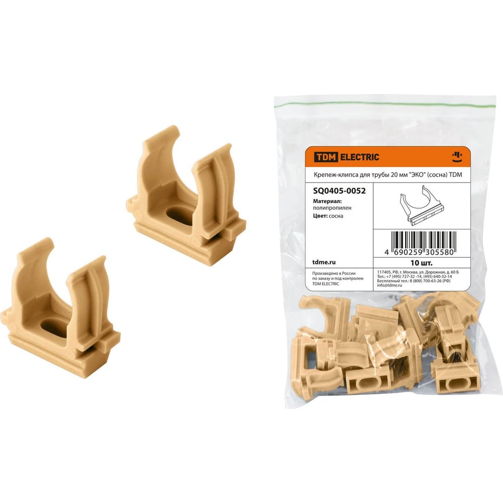 Крепеж-клипса для трубы TDM ELECTRIC 20 мм ЭКО сосна SQ0405-0052 используются в оформлении интерьера при деревянном домостроении или при отделке помещений материалом структурой под дерево. Для крепления труб гофрированных и гладких жестких из ПВХ серии «ЭКО» к поверхности на стены или потолки. Применение: Для жилых помещений (коттеджи, квартиры, дома, дачи). Для объектов инфраструктуры (больницы, детские сады, школы). Для объектов коммерческой недвижимости (гостиницы, офисы, торговые центры, общественные помещения).