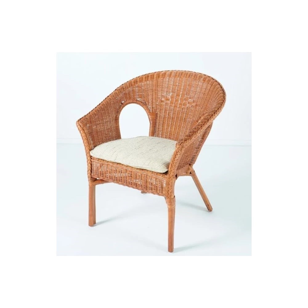 Кресло с подушкой Vinotti 02/08B Коньяк – изысканное дополнение интерьера в частном доме, ресторане или отеле. Кресло комфортно и стильно выглядит, подходит для дома и улицы, служит не менее двух десятилетий. Выполнено из натурального ротанга, который устойчив к изменению температуры, не гниет, не выцветает на солнце. Несмотря на изящное плетение выдерживает большой вес. Каждое плетеное кресло уникально, так как делается вручную. Кресло имеет небольшой вес, что позволяет его свободно перемещать.