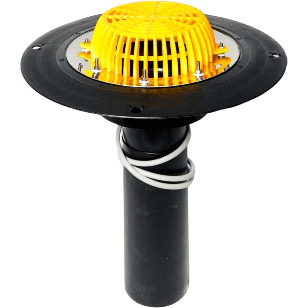 Воронка кровельная Татполимер 110х450 мм с подогревом ТП-01.У.100/4-Э 29620 предназначена для отвода дождевой и талой воды с плоских кровель в дождевую канализацию. Листвоуловитель позволяет предотвратить попадание веток, листьев и прочего мусора в дождевую канализацию.сырье для корпуса воронки и листвоуловителя – полипропилен;сырье для прижимного и нижнего фланцев – нержавеющая сталь;напряжение/максимальный потребляемый ток – 220÷230 В/0,16 А;теплоотдача кабеля, не более – 30 Вт/м;длина соединительного кабеля, не менее – 1,5 м (3х1,5 мм);наименьший радиус изгиба кабеля – 10 мм;максимальная температура поверхности кабеля – +65 °С;максимальная температура внутренней поверхности воронки – +55 °С;диаметр фартука приемной воронки – 444 мм;выходной диаметр – 110 мм;условная высота выпускного патрубка – 450 мм;пропускная способность, не менее – 10 л/с;температура окружающей среды – от -50 °С до +90 °С;температура отводящей жидкости, не более – +85 °С;масса нетто, не более – 2,7 кг;максимальная разрешенная нагрузка, не более – 150 кг;