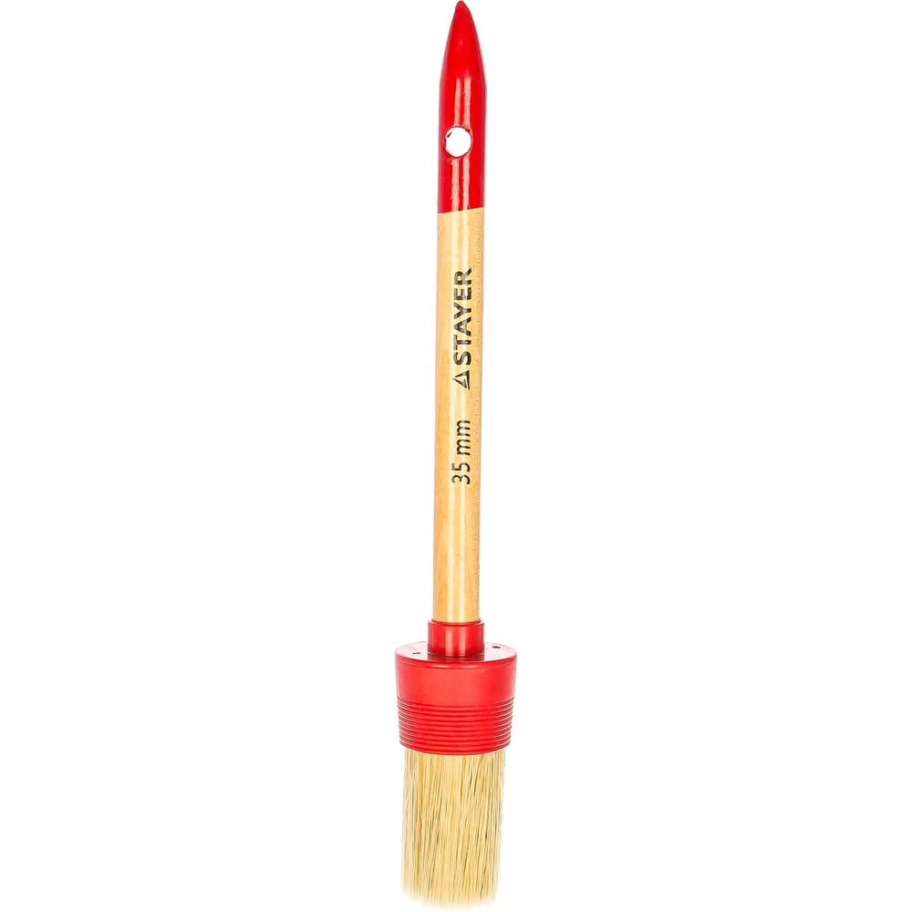 Круглая кисть STAYER UNIVERSAL-STANDART 0141-35 используется для нанесения масляных красок, эмалей и других лакокрасочных материалов на различные поверхности. Размер кисти составляет 8 х 35 мм. Бандаж не подвержен коррозийному разрушению, т.к. изготовлен из пластмассы. Длина щетины - 45 мм.