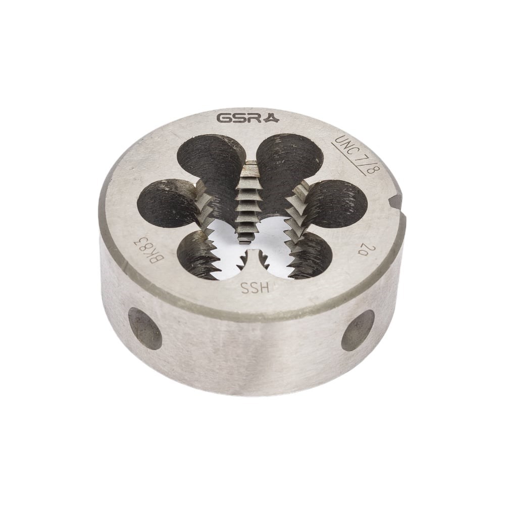 Круглая плашка GSR UNC 7/8-9 DIN EN 22568 B HSS B00462230 предназначена для нарезания дюймовой американской резьбы UNC форма В (круглые плашки с угловым пазом) со спиральной подточкой. Материал обработки - нелегированные углеродистые стали, с пределом прочности до - 800 Н/мм2. Автоматные стали, деформируемые латуни, алюминиевые сплавы - кремний более 10%, цинковые сплавы, медные сплавы, бронза. DIN EN 22568 = Немецкий институт по стандартизации, В= форма плашки (с угловым пазом) UNC = дюймовая американская национальная резьба, размер в дюймах (шаг резьбы количество витков на дюйм), 2a = класс точности по DIN 802, часть 1, HSS = быстрорежущая сталь группы сплавов HSS, Направление резьбы правое.