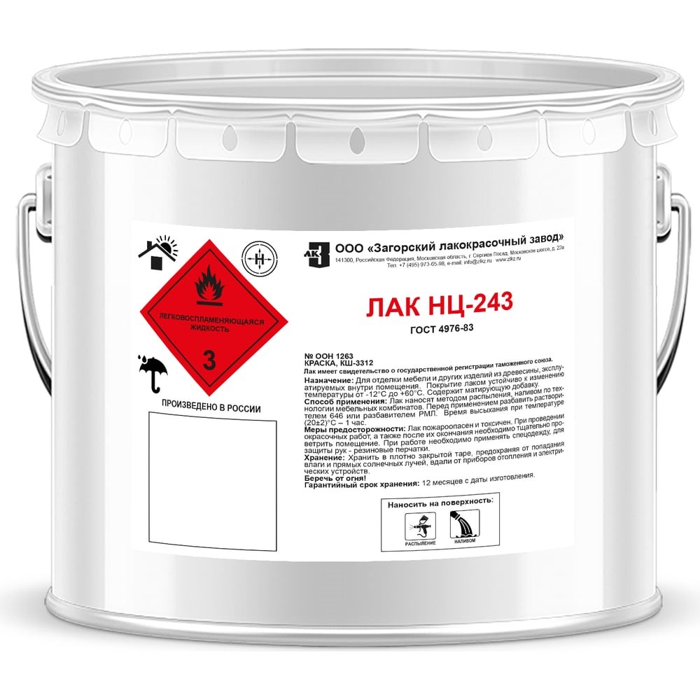Лак ЗАГОРСКИЙ ЛАКОКРАСОЧНЫЙ ЗАВОД НЦ-243 10 кг ZLK04889 предназначен для окраски изделий и мебели из дерева. Удобство использования. Имеет хорошую растекаемость, а также обладает высокой адгезией. Подчеркивает красоту дерева и придает ему благородный блеск. Покрытие устойчиво к перепадам температур, свето- и теплостойкое и влагостойкое, защищает поверхность от неблагоприятных факторов — изменения температуры, влажности, механических повреждений, износа.