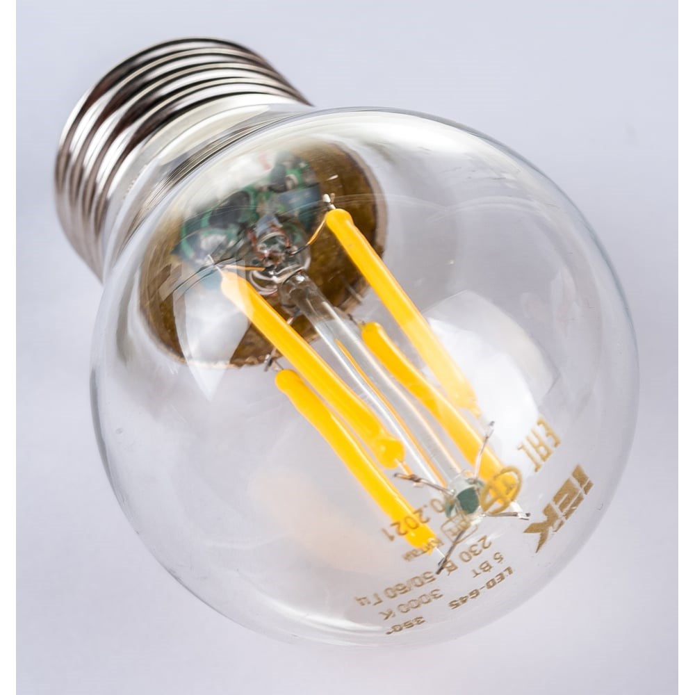 Лампа LED G45 шар прозр. 5Вт 230В 3000К E27 серия 360° IEK с нитевидным светодиодом (филаментная нить) является одним из самых эффективных источников света. Главное отличие от обычных светодиодных ламп – угол рассеивания света до 360° (дополнительный комфорт для глаз). Лампа применяется в осветительных приборах бытового назначения. Представлены в 3 вариантах: с прозрачной, золоченой и матовой колбами. Соответствуют требованиям Технических регламентов Таможенного союза ТР ТС 004/2011, ТР ТС 020/2011, МЭК 62560 и постановления Правительства РФ от 10.11.2017 № 1356.