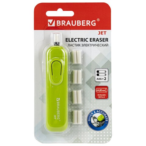 Ластик электрический BRAUBERG JET, питание от 2 батареек ААА, 8 сменных ластиков, салатовый, 229615