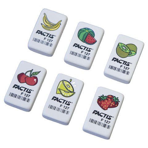 Мягкий ластик F 127 имеет прямоугольную форму и поставляется в белом цвете с дизайном "Фрукты" в ассорти. Обеспечит легкое и чистое стирание без образования бумажной пыли. Размер - 40х24х10 мм.
