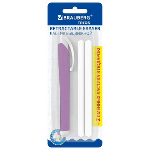 Ластик выдвижной + 2 сменных ластика BRAUBERG "TRIOS", 124х12х12 мм, лавандовый корпус, 272691