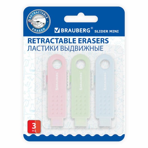 Ластики выдвижные BRAUBERG "Slider Mini", НАБОР 3 ШТУКИ, 68х18х12 мм, пастельные цвета, блистер, 271992