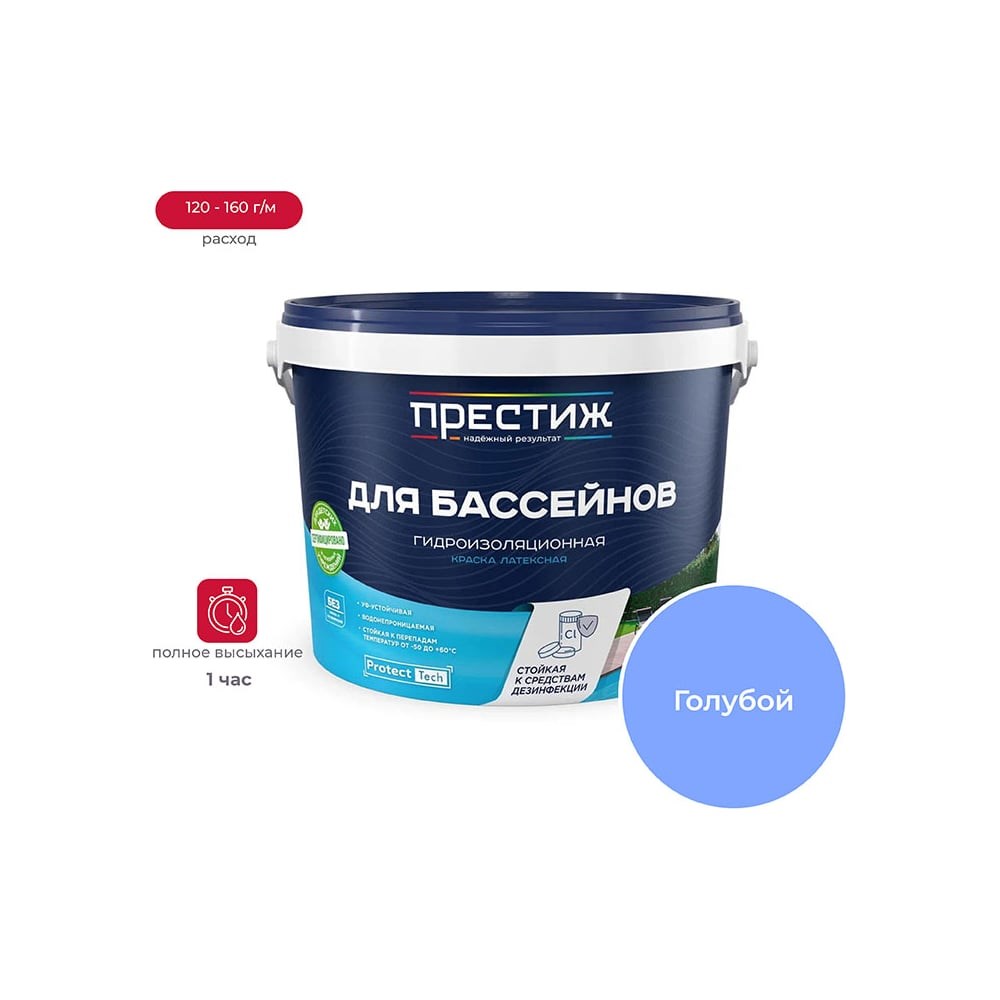 Предназначена для защиты и окраски поверхностей бассейнов. Технические характеристики: Состав: высококачественные акриловый латекс, пигменты и наполнители, целевые и антисептические добавки, вода; Способ нанесения: валик, кисть, краскопульт; Разбавитель: вода; Степень глянца: матовая Запах: отсутствует; Время высыхания: 1 ч; Расход: 120 - 160 г/м²; Температура нанесения: от +10 до +35 °С; Цвет: голубой; Вес: 10 кг.
