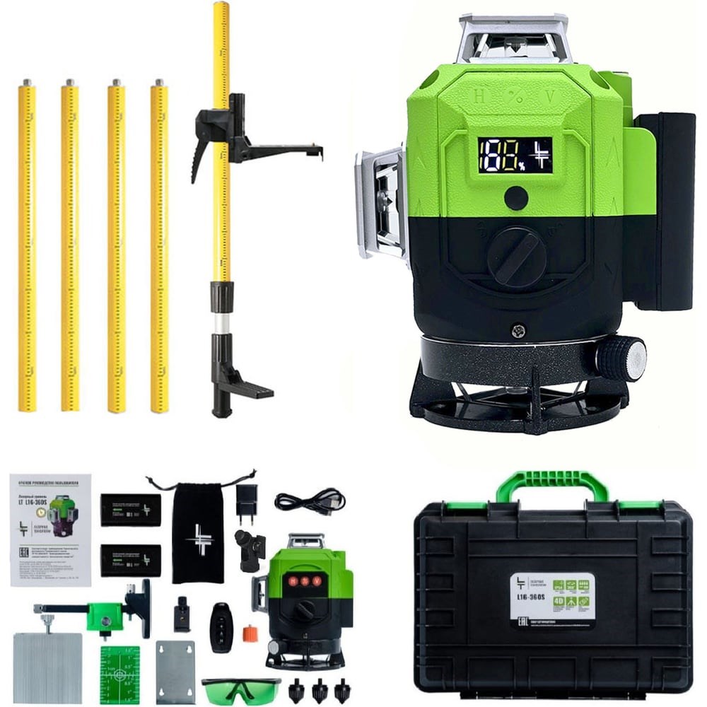 Профессиональный лазерный уровень LT L16-360S + штатив 3.6 м L16-360S/3.6м выстраивает 4 плоскости в 360 градусов (в круговую): 2 вертикальные плоскости с пересечением под прямым углом и 2 горизонтальные линии снизу и сверху уровня. Работает от Li-ion батареи 6000 Мач. Особенности: до 8 часов работы при постоянном свечение луча лучи включаются как с сенсорных кнопок на корпусе устройства, так и с пульта дистанционного управления зеленый цвет луча лучше виден на свету и менее вреден для глаз противоударный и влагозащитный кейс для переноски устройства Уровень проходит трехступенчатый контроль проверки качества сборки на заводе-производителе и инспекционный контроль приемки товара. ВНИМАНИЕ!!! Цвет аксессуаров может отличаться от фото!