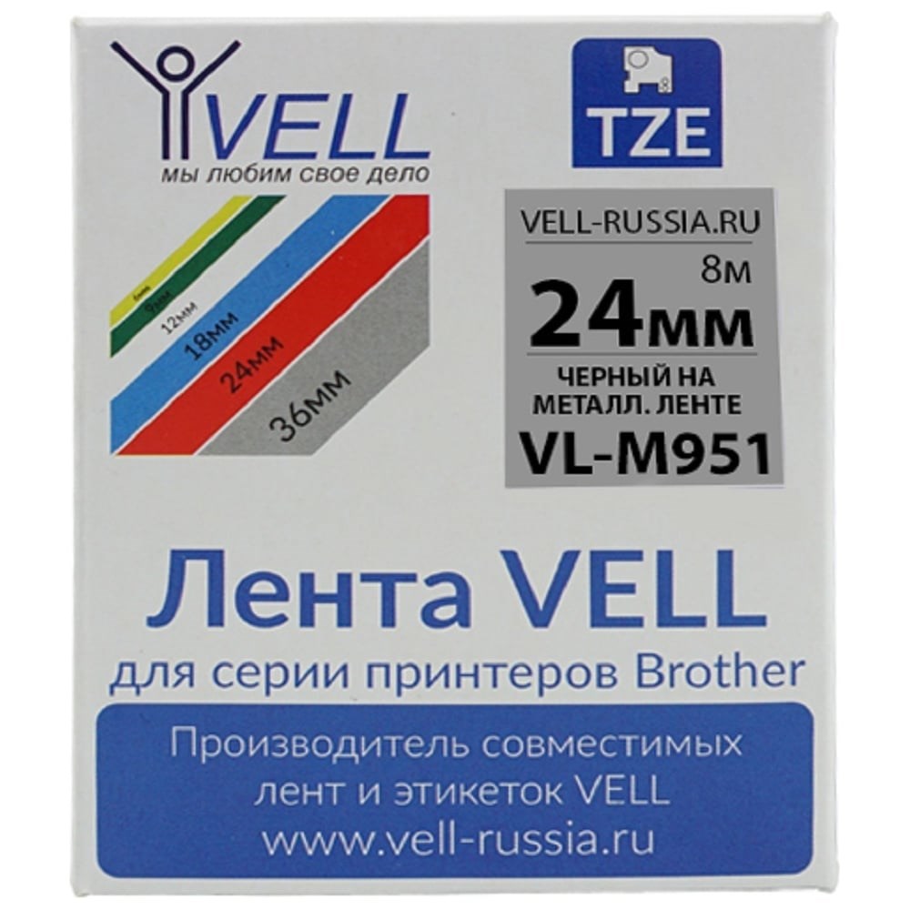Лента Vell (Brother TZE-M951, 24 мм, черный на металлизированном) без проблем подойдёт на принтеры Brother. Неоригинальная лента отлично держится на любых поверхностях, стойкая к ультрафиолетовым лучам и защищена от истирания. Длина 8 метров, ширина 24 мм, черный текст на серебряном фоне. Подходит для принтеров: PT D600/ 2700/ P700/ E550. Выдерживают диапазон температур от -40°C до +80°C.