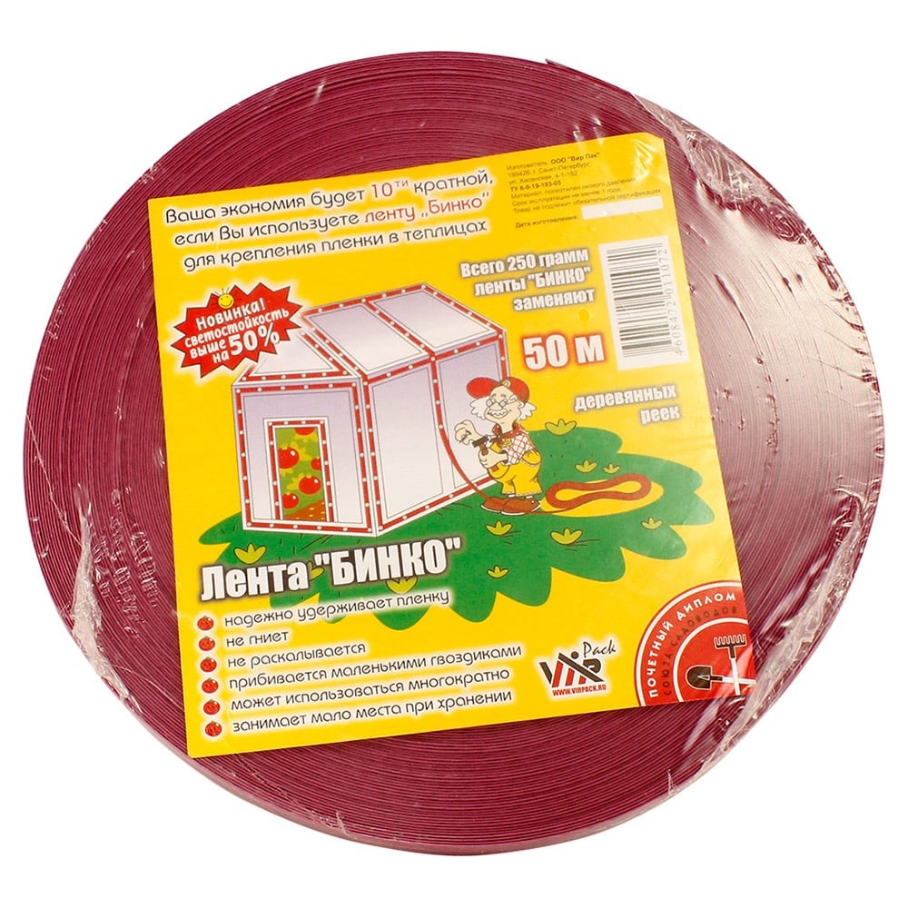 Лента для теплиц Бинко 04614 используется для крепления укрывного материала к каркасу теплиц.Не содержит вредных для окружающей среды веществ. Не рассыхается под воздействием УФ-лучейи не гниет.Крепится маленькими гвоздями или строительным степлером, при необходимости возможно повторное использование.