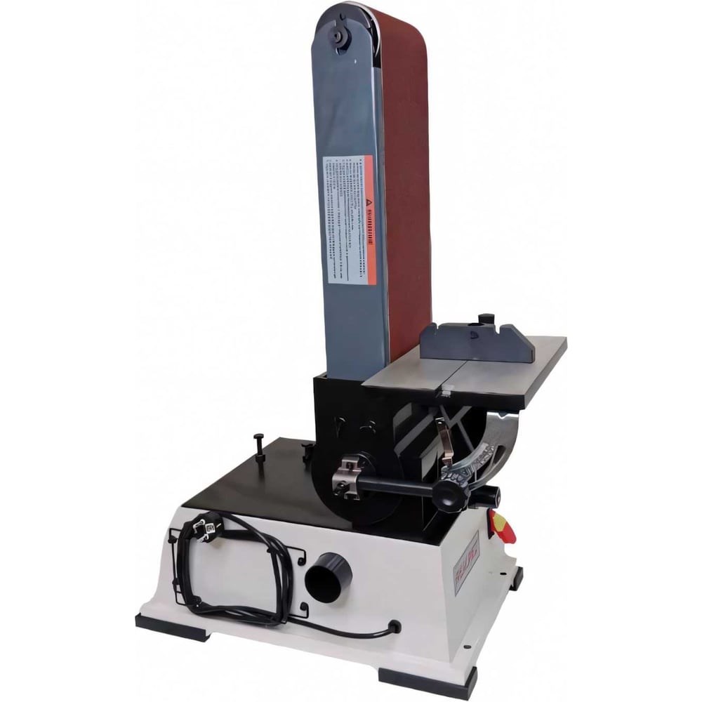 Ленточно-дисковый шлифовальный станок эффективен в металлообрабатывающей промышленности. Оборудование используется для финишной полировки поверхностей деталей. Станок настольного типа. Корпус станка – сварной, стальной. Рабочий стол изготовлен из алюминия и имеет пазы для установки угловых упоров как для ленточного, так и для дискового шлифования. Стол имеет угол наклона от 0° до 45°. Ленточный шлифовальный узел поворачивается. Абразивный материал стандартный: лента: 1219x152 мм, диск: Ø228 мм. Устройство крепится к верстаку с помощью антивибрационных опор, но для дополнительной безопасности может быть закреплено. Для этого в опоре предусмотрены четыре отверстия.