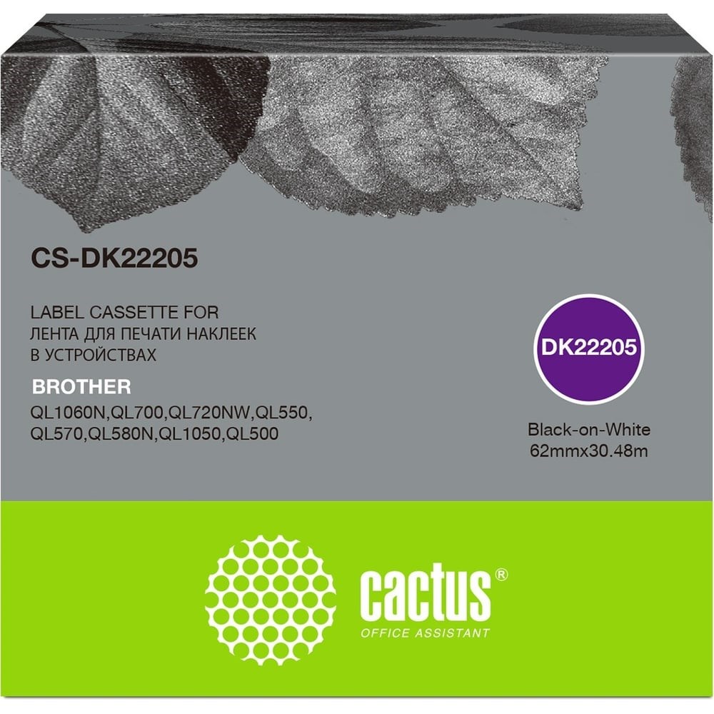 Ленточный картридж Cactus dk-22205 черный, для brother p-touch ql-500, ql-550, ql-700, ql-800 CS-DK22205 непрерывная бумажная лента 62 мм х 30,48 м, белая. Бумажные наклейки подходят для маркировки различных изделий и упаковки. С их помощью можно создавать этикетки с логотипом, штрих-кодом, бейджи для посетителей или почтовые наклейки для доставки. Широкая сфера применения: дома, в офисе, на производстве. Совместим с принтерами: Brother P-touch QL-500, QL-550, QL-700, QL-800.